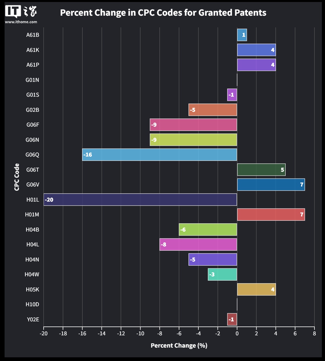 在技能细节方面,评释揭示了半导体领域的权贵风向调度。尽管 AI 发展对芯片需求繁华,但传统芯片专利(H01L 类别)的获批量却同比着落了 20%。